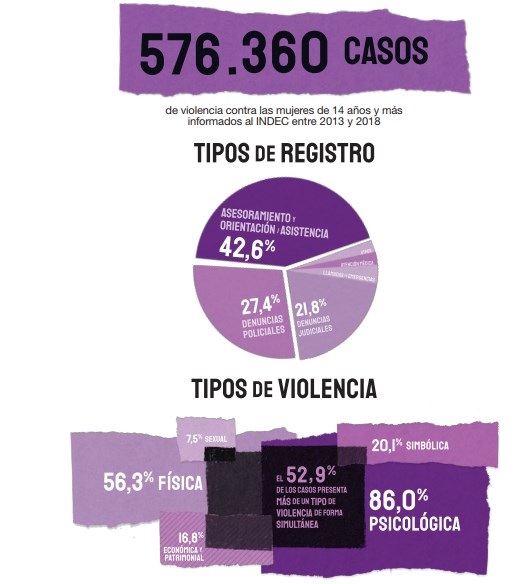 «El total de casos de violencia contra las mujeres de 14 años y más informados al INDEC entre 2013 y el 31 de diciembre de 2018, por parte de los organismos públicos que registran casos de violencia contra las mujeres por razones de género, es 576.360. Se advierte que este valor no debe ser comparado respecto del presentado por el INDEC en la publicación del RUCVM de 2018, ni tampoco interpretado como un incremento de casos de violencia contra las mujeres en la Argentina, dado que dicha cantidad obedece a que durante 2018 se han recopilado datos de un mayor número de organismos y también a que se ha sumado información de años anteriores» se difundió.