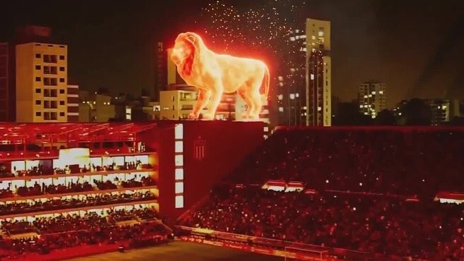 Un león de fuego, reproducido a través de un holograma, sorprendió a todos y caminó por sobre las tribunas.